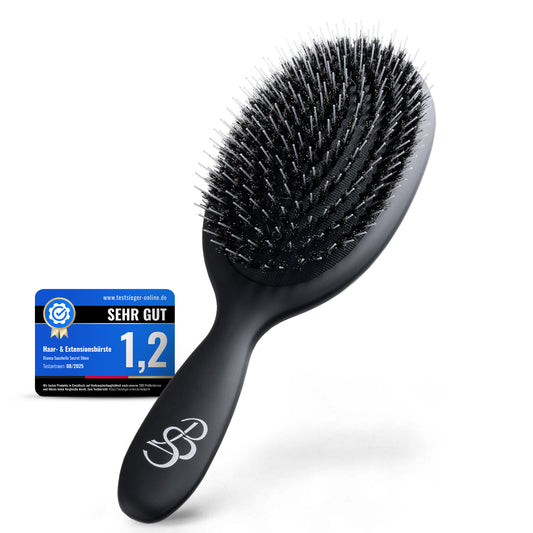 Extensions Bürste für Echthaar&Eigenhaar Bianca Sauchella Secret Shine Wildschweinborsten & Keratin Stifte Haarbürste ohne Ziepen Anti Frizz schonend für Tape In Bonding & Clip In Extensions (Schwarz)